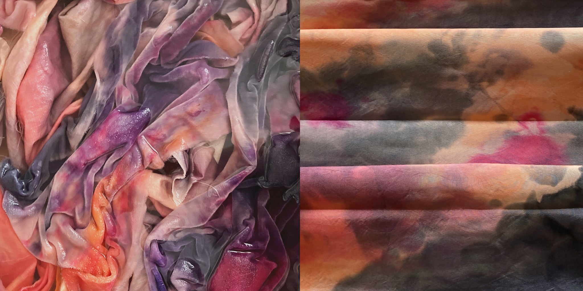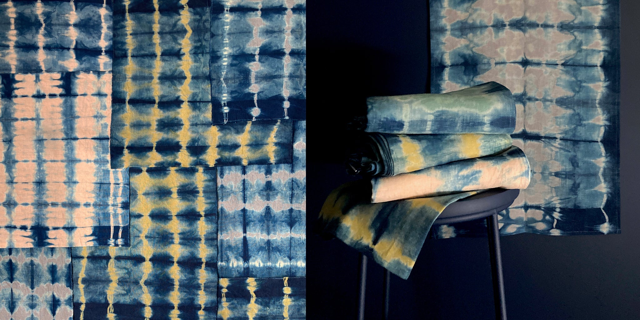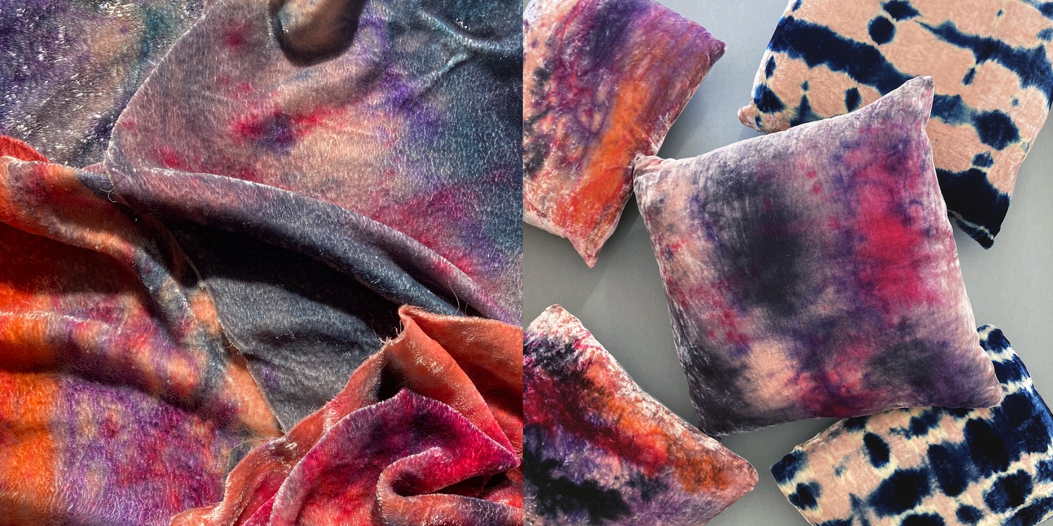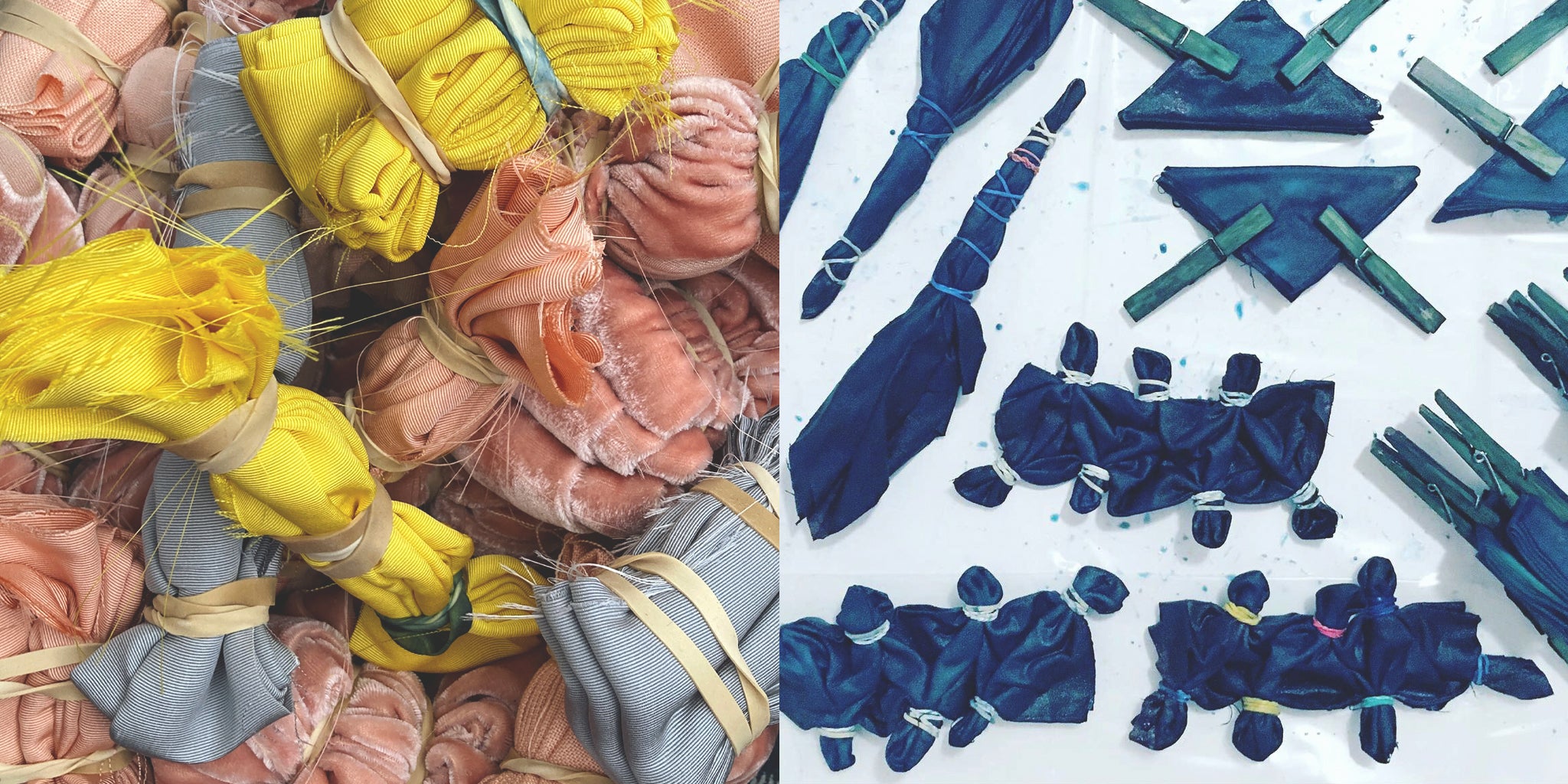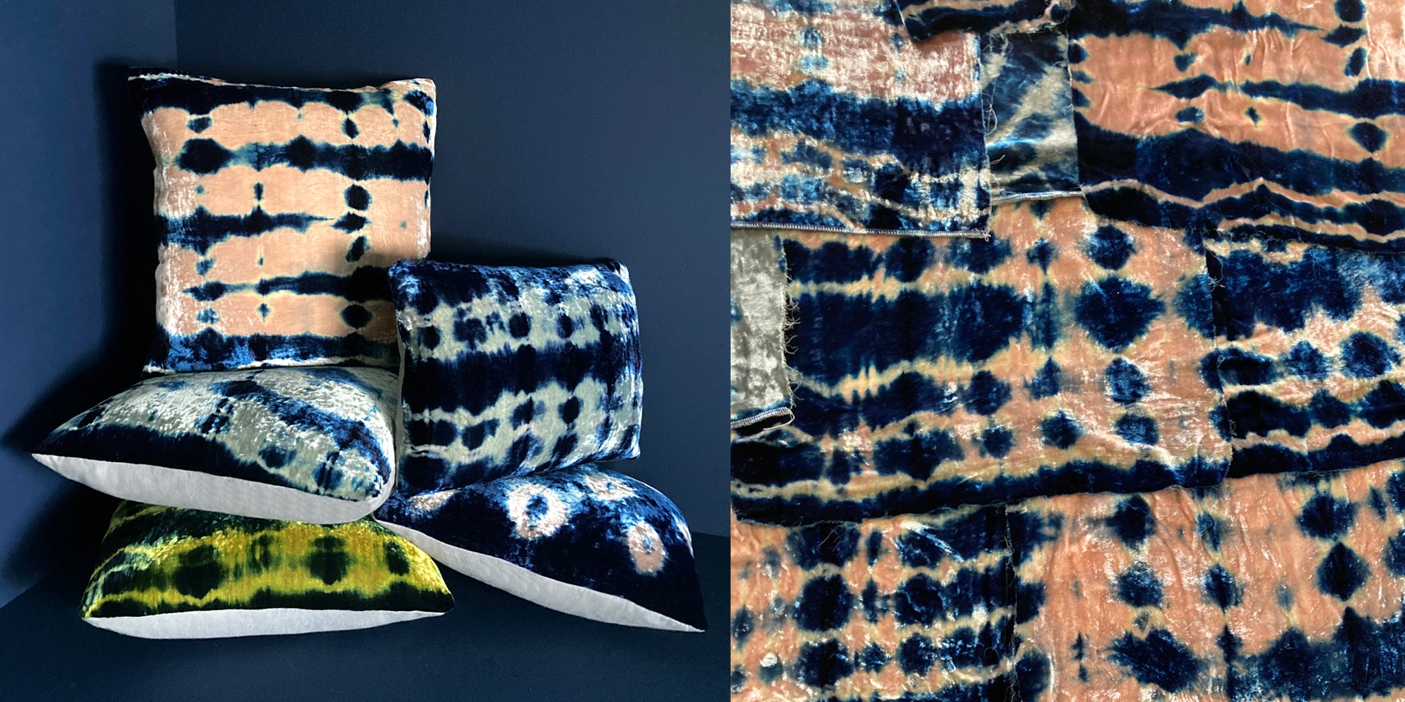 First, Jacqueline starts with a color palette and fabric qualities. She is drawn to dressmaking fabrics, and often uses them within her line (her fashion background is ever present). When she begins a new design, sourcing the right fabric is crucial. Jacqueline works with natural fibers and one of the core elements of her line is that she starts with a color fabric base rather than white. She loves silk velvet because of the luminosity of the fabric and how it absorbs dyes, resulting in undulating ripples of color. The inkblot patterns of her pieces are intentional. She designed fold patterns that create fluid lines of dye across the fabric, resulting in a painterly quality; unlike traditional shibori that features crisp geometric patterns. Once the pieces are folded and bound, they are ready to be dyed. Indigo dye works by oxidation, so a piece is immersed in the dye, then left out of the dye for 10-20 minutes to oxidize. Depending on the depth of color that Jacqueline wants to achieve, this process goes on for several rounds. She is very methodical in her note taking for different folds, preparing the fabric, and the length of time the panels stay in the dye. As a result, she can achieve the same patterns again and again; however, each piece is truly a work of art made by hand.