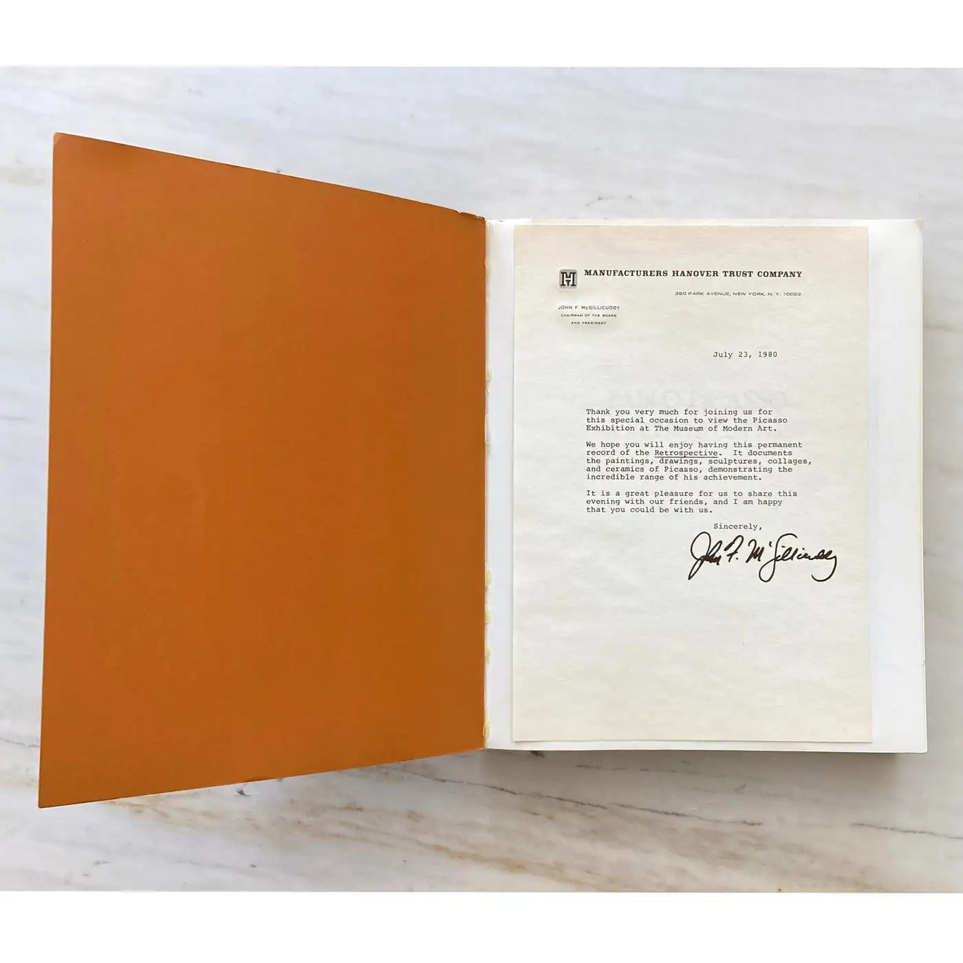 PABLO PICASSO: A RETROSPECTIVE was on view at the Museum for a four-month period from May 1 to September 16, 1980. This landmark exhibition consisted of over 700 works in every medium in which the artist worked—painting, sculpture, ceramics, theater and costume design, drawings, and prints. Generously lent by private and public collections from all over the world, these works span the long creative life of this master, generally acknowledged to be the most central figure of 20th century art. This edition is special because it contains a signed letter by John F McGillicuddy attached to the first page, see photo. Nearly 800 carefully selected works are illustrated. 208 of them in color-paintings, drawings, sculpture, prints, collages, ceramics. They encompass the entire span of Picasso's life and the effortless reach of his creative spirit. A Picasso chronology introduces each section of pictures, accompanied by additional documentary and reference photographs, both of works or art not in the exhibition and of studio and personal scenes. 463 pp.; 758 illus. Published in 1980 and edited by Jane Fluegel, this rare book from MoMA Publications is available in extremely limited quantities.